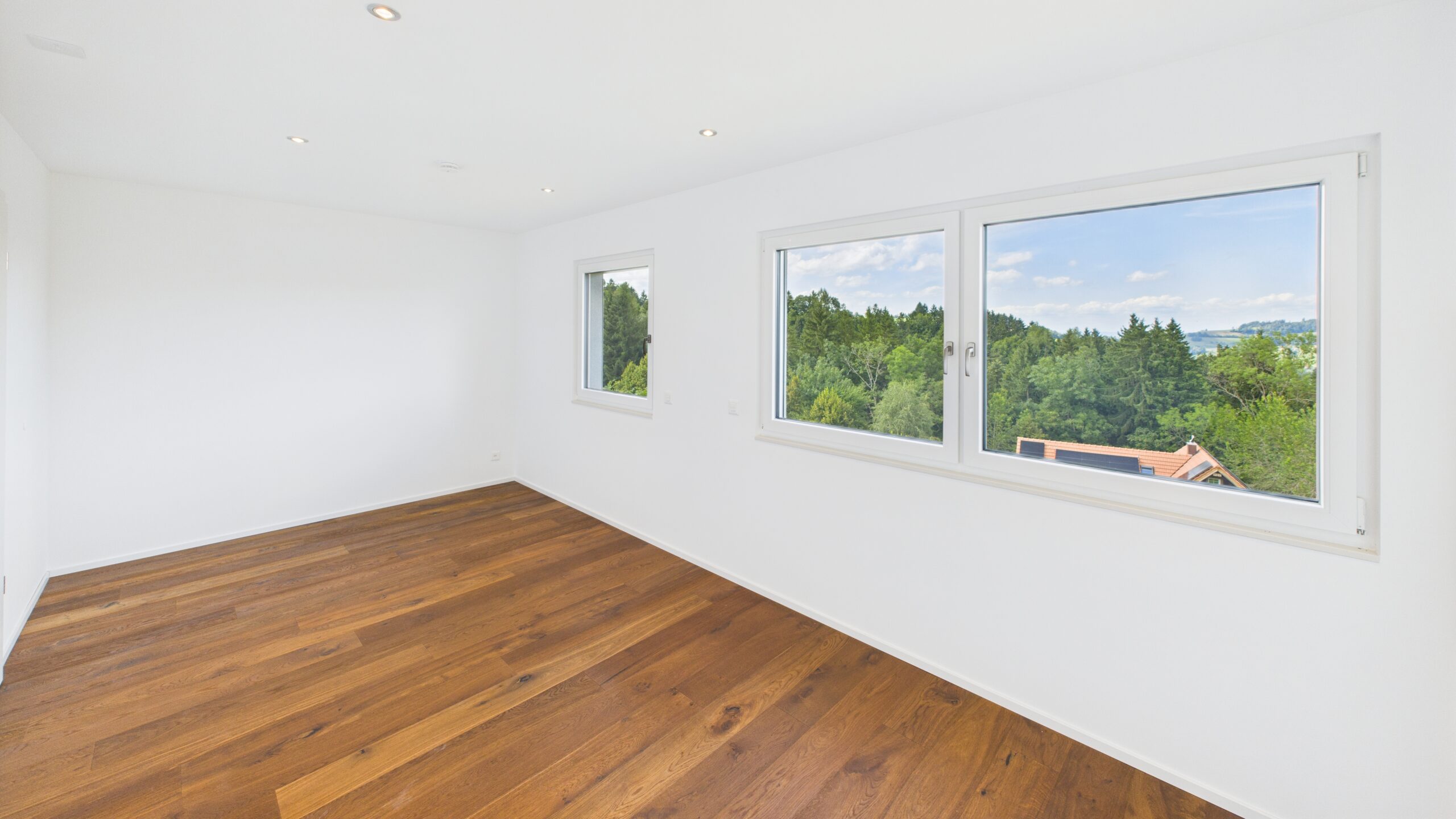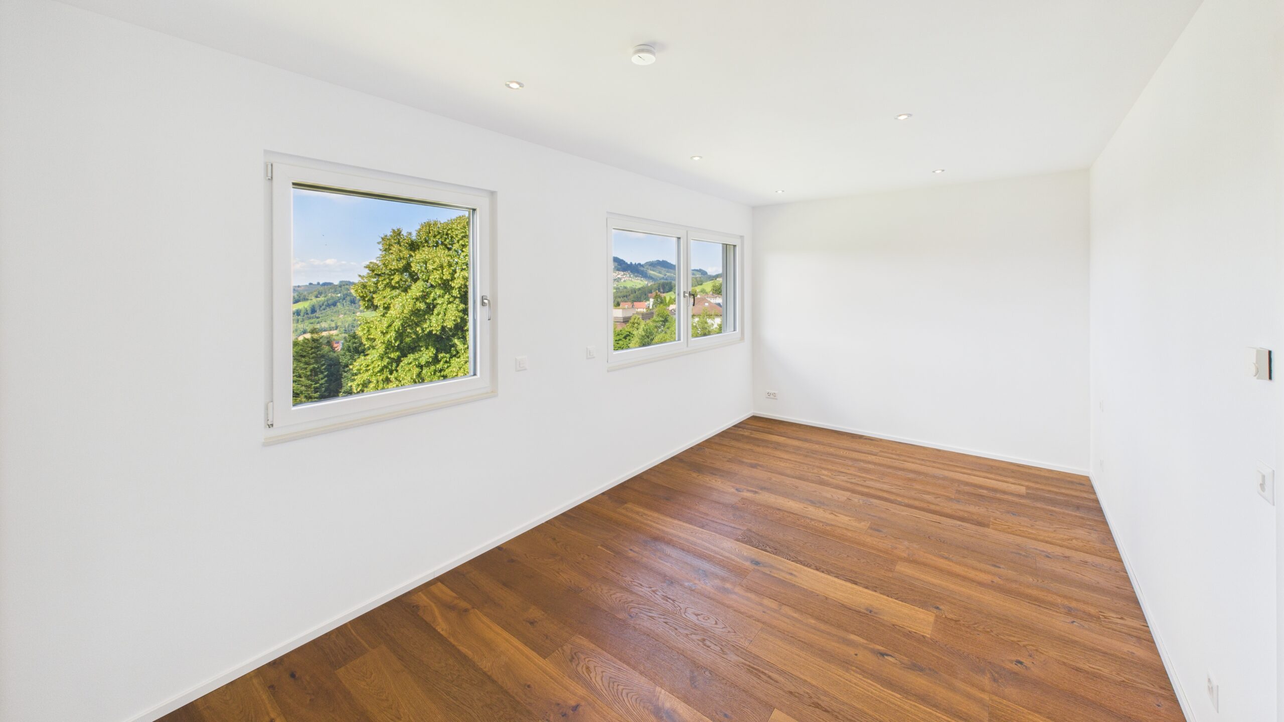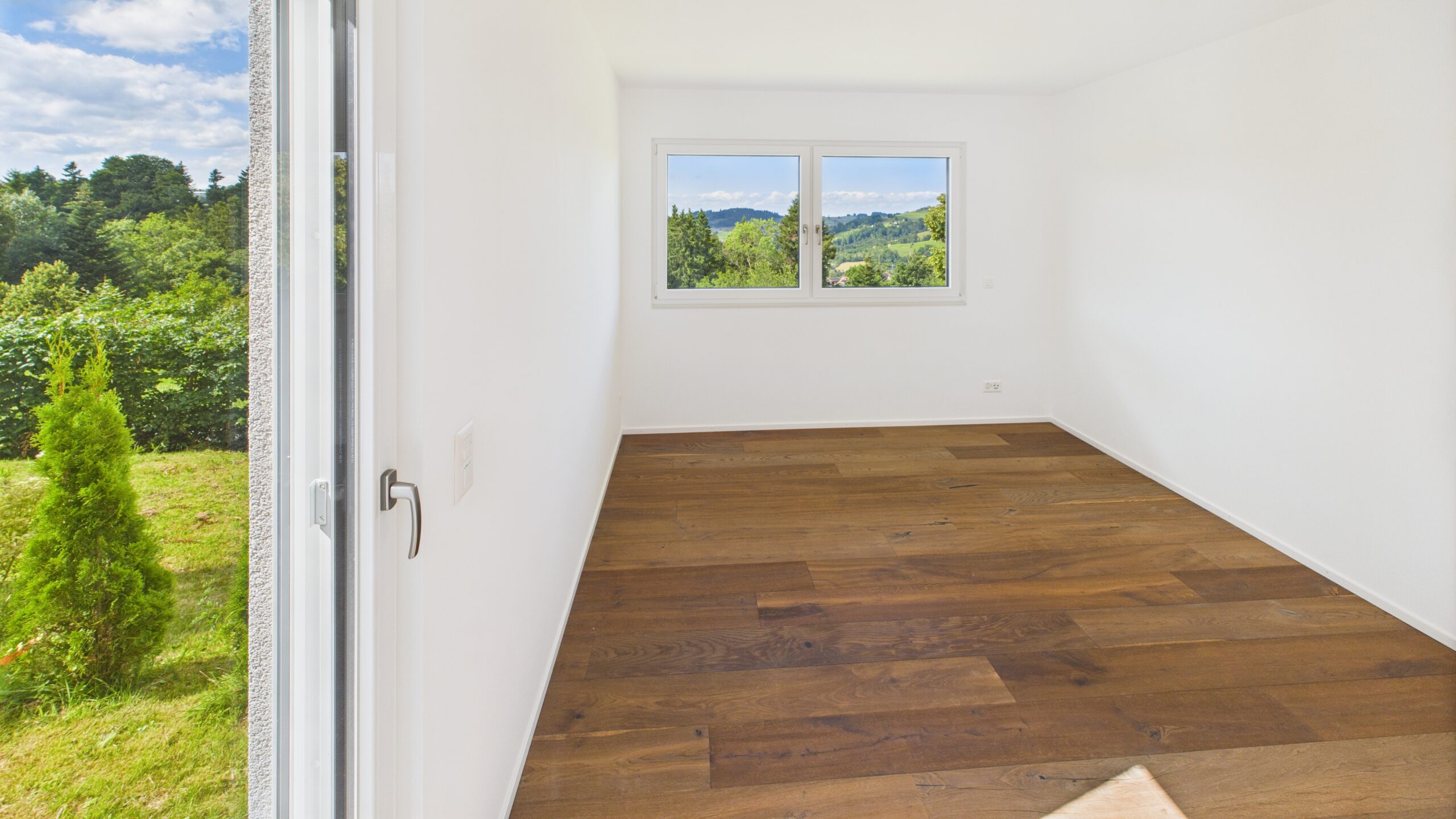 Auf insgesamt drei Etagen erstreckt sich die grosszügige Nettowohnfläche von knapp 200 qm, die durch die hochwertige Elementbauweise besticht. Mit 6.5 weitläufigen Zimmern bietet dieses Haus ausreichend Platz für die gesamte Familie. Sie betreten das Haus im obersten Stockwerk, wo sich der lichtdurchflutete Eingangsbereich befindet. Hier gelangen Sie in die offene und einladende Küche sowie in das heimelige Wohn- und Esszimmer. Diese Bereiche sind ideal für gesellige Stunden mit Familie und Freunden. Das Gäste-WC ist ebenfalls auf dieser Etage untergebracht. Der nordseitige Balkon ermöglicht Ihnen einen unverbaubaren Panoramablick auf die umliegende Landschaft.